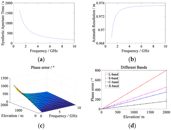 Next, we analyze how the synthetic aperture time and azimuth resolution vary with signal frequency, and how signal frequency and elevation affect the phase error. Four groups of common bands, namely, L band (1.5 GHz), S band (3 GHz), C band (4 GHz) and X band (9.5 GHz), and four groups of different elevations were set to get the change trend of phase error with elevation and frequency respectively.