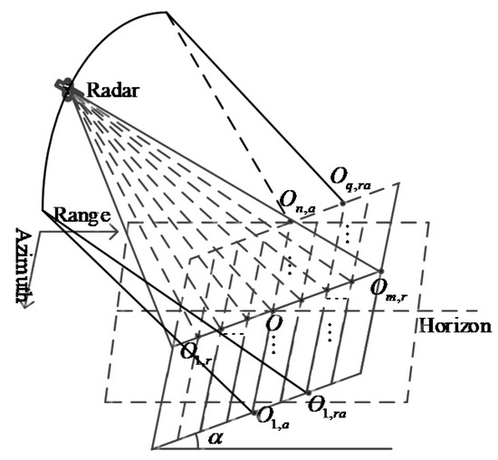 We firstly established a classical SAR imaging geometric model and the elevation information of the target was taken into account, as shown in Figure 2. The target elevation is , the look-down angle is , and the shortest slant range of the zero elevation target and the target is and respectively.