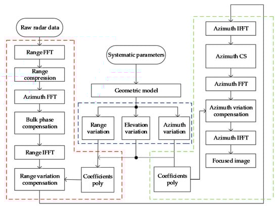 Firstly, bulk phase compensation is carried out, and the center point of the scene is taken as the reference point. The 2D spectrum of this point can be obtained through series reversion and POSP, and the echo data can be multiplied by the 2D spectrum of the reference point in the 2D frequency domain, followed by azimuth-backward compression. After bulk phase compensation, range and azimuth coupling can be removed. Next, the spatial variation of elevation is decomposed into range and azimuth, and the 3D space variation can be compensated in accordance with range spatial variation and azimuth time variation in turn.