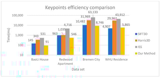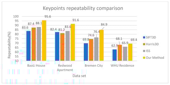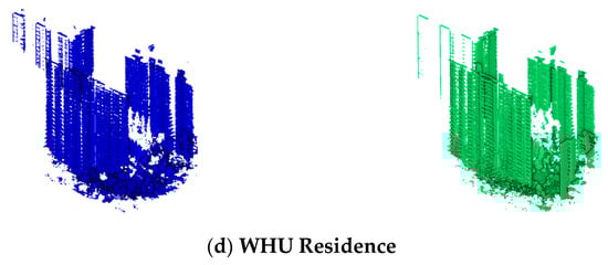 - Repeatability:Given point clouds of the same scene with a different viewpoint, there is a known transformation matrix between the data of the two point clouds. A keypoint detector detects a set of keypoints and from , respectively. A keypoint is repeatable if the distance between and its nearest neighbor is less than the threshold . For the value of in the experiment, we use 0.1 m for indoor data (BaoLi House and Redwood Apartment) and 0.2 m for outdoor data (Bremen City and WHU Residence). The formula for repeatable judgment of keypoint is:The formula for calculating the Repeatability is:where is the number of keypoints in point cloud .