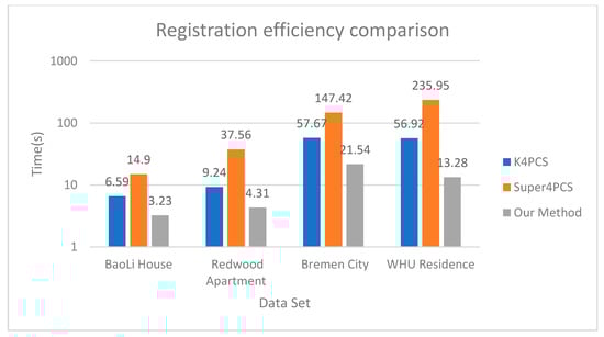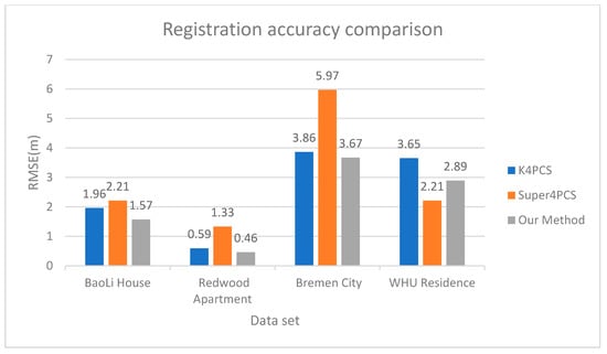 - Registration Accuracy:The root mean square error (RMSE) between the reference registration results of the converted input set was used in evaluating the registration accuracy:where n is the number of points in the point cloud; the i-th point coordinate in the source point cloud S after transformation; and is the i-th point coordinate in the reference registration point cloud.