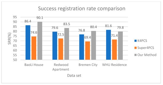- Success rate:Based on the root mean error, the registration success rate (RS) can be directly calculated using the formula:The RMSE threshold can be set according to the application requirements. The formula for calculating the successful registration rate (SRR) is:where is the number of successful registrations, and N is the number of experiments. Since our method involves the RANSAC process, SRR is evaluated in a series of 50 trials.