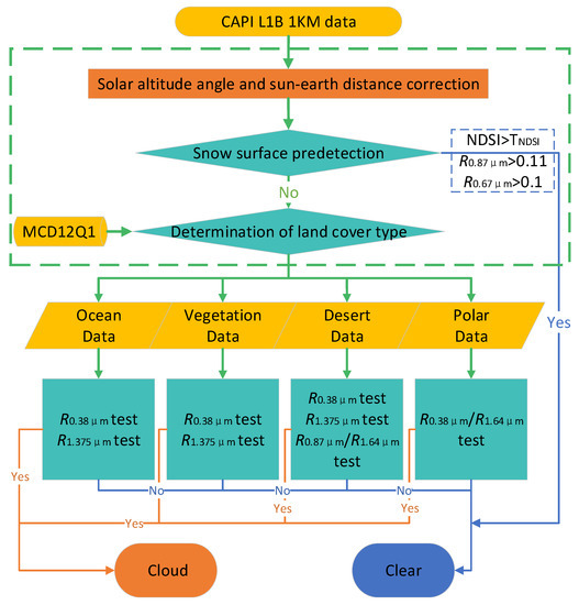Figure 3 shows the flow chart of NNDT algorithm using CAPI data. There are four steps, including solar altitude angle and sun-earth distance correction, snow surface predetection, determination of land cover type, and cloud detection for four underlying surfaces. The first three of them are pre-processing work. The fourth step is the key part of the NNDT algorithm.