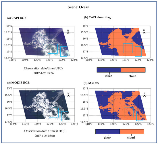 Case over the northwest coast of Australia and Indian ocean at 05:36 UTC 26 April 2017 for CAPI and at 05:40 UTC 26 April 2017 for MODIS. The “time” is the start time when the imager took the image of this scene. (a) The CAPI false color image, (b) the cloud flag image of CAPI derived by applying NNDT algorithm, (c) the MODIS true-color image overlapping with the CAPI scene, and (d) the cloud flag of MYD35 with only “cloud” and “clear” results.
