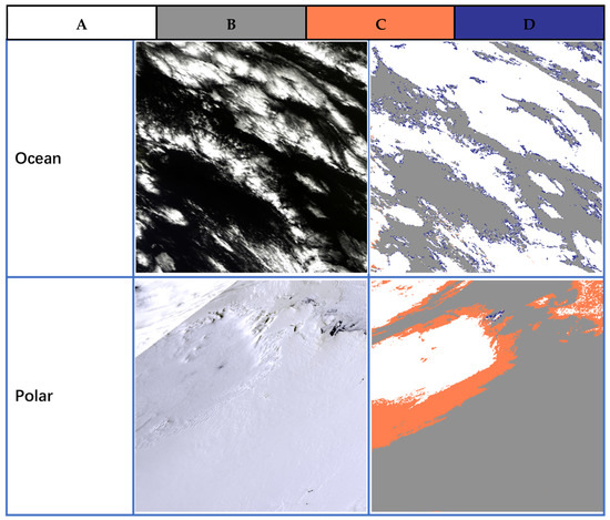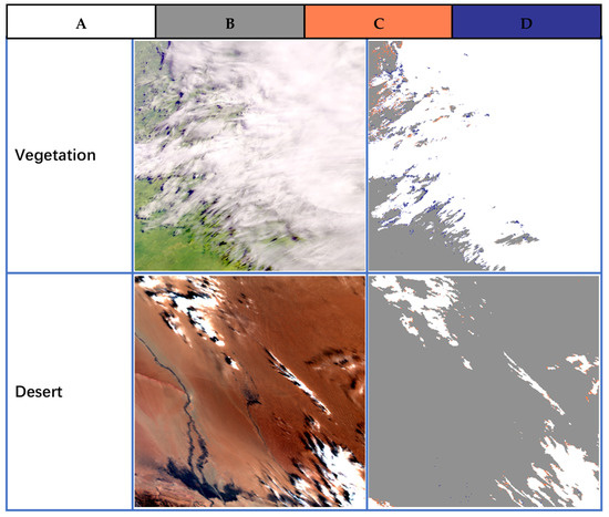 Per-pixel comparison of NNDT cloud identification results (NNDT-CLFG) based on SGLI observation data and SGLI-CLFG. The pixels represent (A). NNDT-CLFG and SGLI-CLFG are both cloudy (white), (B). both are clear (gray), (C). NNDT-CLFG are cloudy and SGLI-CLFG are clear (orange), and (D). NNDT-CLFG are clear and SGLI-CLFG are cloudy (blue). Column 1: Composite true-color images of SGLI. Column 2: Per-pixel comparison image for cloud-screening results obtained by NNDT algorithm and SGLI-CLFG. Line 1: Case over vegetation at T0527 26 April 2018 for SGLI. Line 2: Case over desert at T0524 10 March 2018 for SGLI.