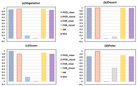 The POD and FAR scores are the measure of the efficiency of the cloud identification algorithm in determining either cloud or clear events [54]. The POD values are supposed to be as close to 1 as possible. Conversely, the FAR values are supposed to be as close to 0 as possible. The HR values estimate the overall efficacy of the cloud detection algorithm. In addition, the KSS index is a complementary measurement method, reflecting the misclassifications to some extent [54]. It is used to evaluate the performance of the algorithm in separating cloud events from clear events. A value of 1.0 represents a perfect discrimination, while a value of −1.0 describes a complete discrimination failure.