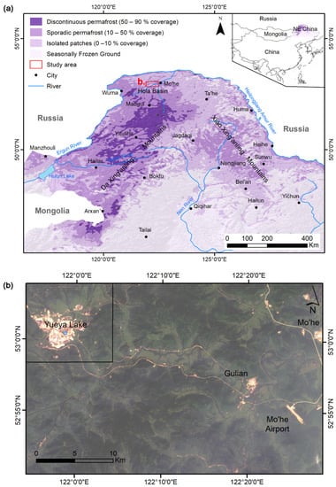 (a) Study area location in Northeast China. Permafrost distribution after Obu et al. [31]. (b) Landsat 8 OLI image (band combination red-green-blue) from 1 August 2019 for the Hola Basin.