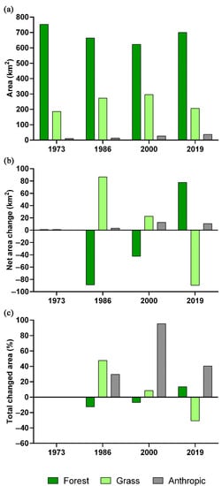 (a) The overall area (km2) of classes forest, grass, and anthropic in the Hola Basin, Northeast China, in 1973, 1986, 2000, and 2019; (b) the net change of classes area in km2, and (c) the net change of classes area in %.