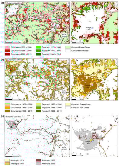 Change maps for the period 1973–2019 in the Hola Basin, Northeast China, for (a) forest cover, (b) grass cover, and (c) anthropic development. I to III are insets of a zoomed view of the Yueya Lake and the Gulian’he coal mine.