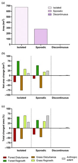 LUCC in the Hola Basin for the period 2000–2019 have been quantified based on the permafrost zonation model of Obu et al. [31] developed for 2000–2016 at 1 km2 scale. According to this zonation map, in the Hola Basin, the isolated permafrost prevails (70.6%), and it is followed by sporadic permafrost (29.2%) (Figure 5a). Only a small patch of discontinuous permafrost (0.2%) is located around the Yueya Lake with little LUCC compared to other permafrost types. The area of isolated permafrost is more widespread than that of sporadic permafrost, while the LUCC are in a relatively similar proportion (Figure 5b,c). The LUCC for the forest and grass classes in the isolated permafrost zones are ranging from −76 to 74%, and in the sporadic permafrost, from −64 to 52%. However, the anthropic extent is significantly larger in the sporadic permafrost zone (65%) than that in the isolated permafrost zone (31%), and it is also notable in the discontinuous permafrost (4%).