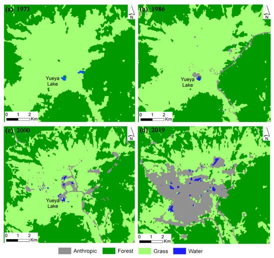 LUCC around the Yueya Lake and the Gulian’he coal mine for the years: (a) 1973, (b) 1986, (c) 2000, and (d) 2019.
