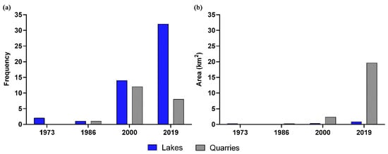 Comparison of the lakes and quarries around the Yueya Lake and the Gulian’he coal mine for 1973, 1986, 2000, and 2019: (a) frequency and (b) surface area.