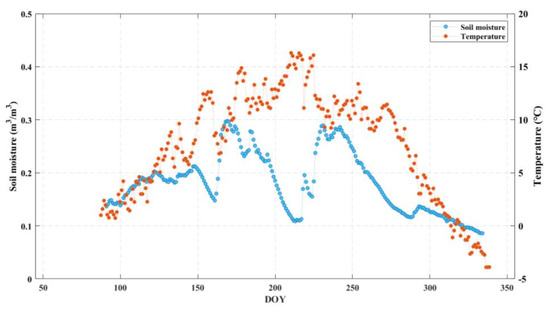 The in situ soil moisture data are obtained from the Nagqu soil moisture and temperature network in the central Tibetan Plateau. The network contains 56 soil moisture stations (Figure 1). This network (ISMN: https://ismn.geo.tuwien.ac.at/en/) provides soil moisture and temperature with a time interval of 30 min at four different depths (0~5 cm, 10 cm, 20 cm, and 40 cm) from 2011 to 2016 [47,48]. The details of the Nagqu network can be found in Yang et al. [49]. Considering the potential penetration depth at C-band, this study selects the in situ soil moisture measurements at the top soil layer (0~5 cm) for the model evaluation and validation. However, there is a serious data loss, as part of the Sentinel-1 images can not completely cover the 56 stations. By appropriate screening, 43 stations are selected for further research. In addition, we have made quality control of the in situ soil moisture data according to ISMN Quality Flags. Figure 2 shows the temporal evolution of the mean values of the measured soil moisture and temperature over the 43 stations from April to November 2015, which indicate a seasonal variability.