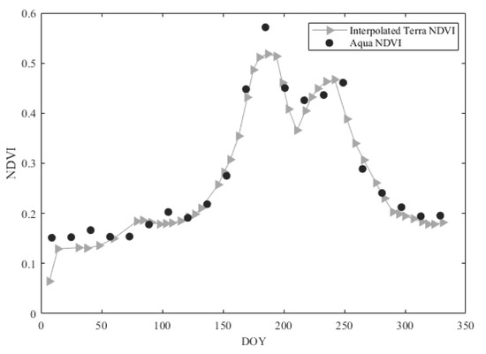 Figure 3. Comparison of interpolated Terra NDVI with Aqua NDVI products over a representative station (L02) in 2015.