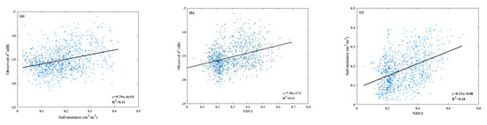 To explore the response of SAR backscattering coefficients to the variations of soil moisture and NDVI, a simple regression analysis is first conducted. As shown in Figure 5, there is a relatively weak positive correlation between the backscattering coefficient and soil moisture (Figure 5a). The deviation of the points from the fitted line is attributed to the differences in vegetation condition, surface roughness and local incidence angle at different stations. A similar weak sensitivity of the C-band SAR backscattering coefficient to measured soil moisture is observed in many previous studies due to the joint effects of soil and vegetation parameters [29,32,58]. In Figure 5b, the influence of the vegetation on the backscattering power was observed. In addition, with an increasing NDVI, an increasing trend is observed in soil moisture (Figure 5c), confirming close coupling between vegetation and soil moisture. Thus, in order to retrieve soil moisture from C-band Sentinel-1 SAR data, it is necessary to better parameterize the vegetation contribution.
