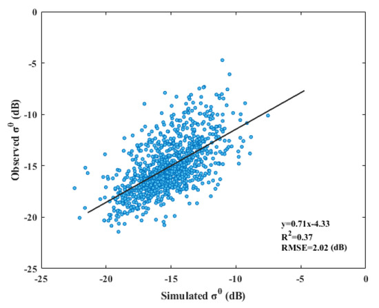 Based on the optimized surface roughness parameters and the measured soil moisture, the backscattering coefficient is simulated. In Figure 7, a relatively high correlation between the simulated backscattering and Sentinel-1 SAR data at VV polarized channel was found. It indicates the feasibility of optimizing the assumed stable surface roughness parameters prior to retrieving the soil moisture.