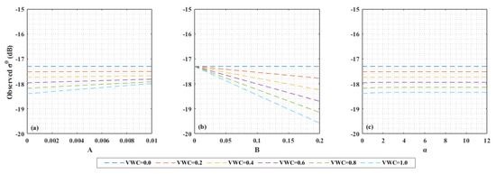 Figure 8. Response of SAR backscatters to variation of vegetation parameters (a) A, (b) B, and (c) α in WCM.