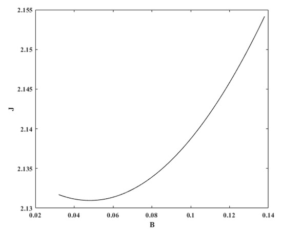 Before the optimization, the sensitivity of simulated SAR backscattering coefficients to the variation of the vegetation parameters (A, B, and α) is analyzed for six different VWC levels. Figure 8 shows the response of simulated backscatters to the three vegetation parameters. As can be seen in Figure 8a,c, almost no changes are observed with increasing values of parameters A and α, but with different VWC levels, the backscatters show a certain difference. In contrast, in Figure 8b, the backscattering coefficients decrease with increasing values of parameter B and the variation amplitude increases with the increase of VWC. It indicates that parameters A and α are not sensitive to soil moisture retrieval, so parameter B should be mainly calibrated in the subsequent process. Similar observations for the vegetation parameters were found in previous studies [59]. Thus, the values of parameters A and α, are set to the “all land uses” values in Table 1. In Figure 9, the parameter B iterates between 0.03 to 0.14 with 100 intervals, and the lowest J value was obtained when B is equal to 0.05.