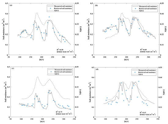 Figure 11. Time series of measured and retrieved soil moisture, with respect to NDVI over four stations (a) L04-M02, (b) L05-M06, (c) L07-M13, (d) M05.