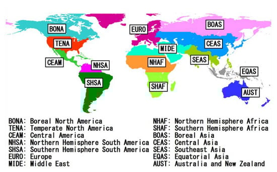 Spatial distribution map for the 14 evaluation regions, according to van der Werf et al. (2006) []. Map was created with ArcGIS version 10.5 (https://www.arcgis.com/ (accessed on 12 March 2021)).