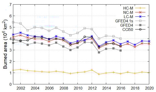 Interannual variation in the global burned area of the three maps of this study (HC-M, NC-M, and LC-M) and previous studies (GFED4, GFED4.1s, and CCI50) between 2001 and 2020.