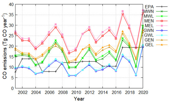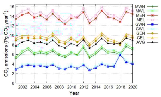 In Table 2, the largest CO2 emissions value was by MEL at 14.5 ± 0.83 Pg CO2 year−1, and the smallest was by GWN at 3.60 ± 0.67 Pg CO2 year−1 from 2001 to 2020; MEL showed much larger emissions than GWN by a factor of 4.0. The MEL result was larger by 42%, and the GWN result was smaller by 57% compared to the average emissions. The CO2 emissions closest to the average emissions were from GEN at 9.04 ± 0.60 Pg CO2 year−1. The estimated emissions were equivalent to 16–58% of the global carbon budget sourced from fossil fuels and industry from 2001 to 2018 [].