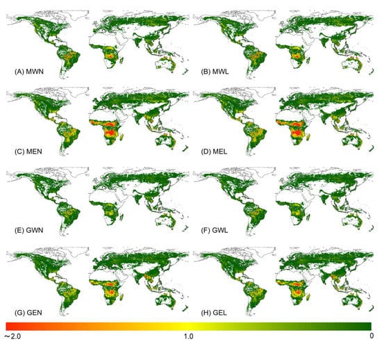 As for the effect of the AGB map, the CO2 emissions of MWN and MWL were estimated to be 54% smaller than those of MEN and MEL, respectively, which commonly use MCD12Q1. Similarly, the CO2 emissions of GWN and GWL were 60% smaller than those of GEN and GEL, respectively, which uses GLC2000. These results show that Globbiomass resulted in higher CO2 emissions than GEOCARBON. The difference is partly because Globbiomass has a larger BD than GEOCARBON in forest and non-forest areas. GEOCARBON is a global forest AGB map, which focused on the forest area and has been evaluated to be 9–18% smaller than its two sources, namely the AGB maps of Saatchi et al. (2011) [] and Baccini et al. (2012) [], in the tropical regions []. Alternatively, Globbiomass used L-band SAR data, which are used to estimate low biomass from the radar scattering in branches and trunks with penetration of the canopy []. These facts are considered as one of the reasons why Globbiomass evaluated AGB to be larger than GEOCARBON and led to a difference in BD of over 50% in non-forest areas (Table 5).