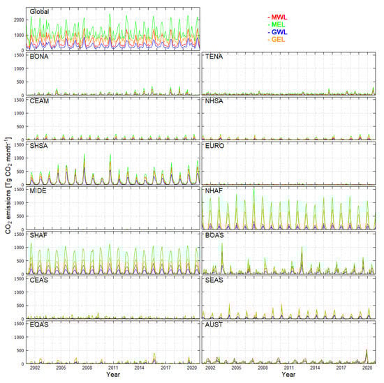 We evaluated monthly CO2 emissions for each of the 14 regions (Figure 1) to understand the regional characteristics and variation. The monthly CO2 emissions of MWL, MEL, GWL, and GEL are shown in Figure 5. Four inventories from NC-M (MWN, MEN, GWN, and GEN) are not in the figure because the differences between NC-M and LC-M in terms of CO2 emissions were small (Table 2). In 10 regions, including the global scale, CO2 emissions were the largest in MEL followed by GEL, MWL, and GWL, respectively, which was similar to the annual emissions (Table 2). However, GEL in SEAS and MWL in AUST showed the largest CO2 emissions in four inventories, respectively. In Table 4 and Table 5, GEL has a larger area and a higher BD in the non-forest areas than MEL in all regions, and the greatest difference (79%) of the BD for non-forest areas was in SEAS. AUST was the only region in which the BD of MWL was higher than that of MEL in the forest areas. These results show that the estimated CO2 emissions are affected by the input datasets of AGB and LCC.