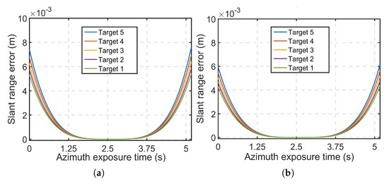 The slant range errors that are induced by the different approximations. (a) The third-order approximation and (b) formula (7).