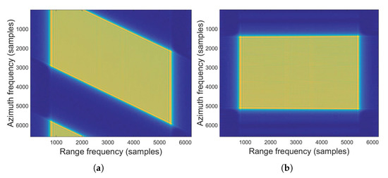 Figure 3 shows the 2-D spectrum of high-squint BiSAR raw data before and after LRCMC operation; the simulation parameters are shown in Table 1, where the squint angles of transmitter and receiver are and , respectively, and the PRF is set to 250, which is approximately twice the Doppler bandwidth. From Figure 3a, due to the the skew of the 2-D spectrum, part of the spectrum is folded into the adjacent PRF band, causing azimuth aliasing. After the LRCMC operation, the spectrum skew phenomenon is corrected, the azimuth aliasing is eliminated, and the orthogonality between the range and the azimuth is significantly increased, which means that the range-azimuth coupling of the 2-D spectrum is significantly alleviated. In [23], the MonoSAR spectrum after LRCMC is called the squint-minimized spectrum, which is also appropriate for the high-squint BiSAR spectrum. However, the LRCMC factor in (9) varies with range, a practical way to deal with this problem is to perform LRCMC within an invariance region to keep the variations of squint angles small, and the size analysis of invariance region can be found in [16,20] (see Appendix C in [16] and Section IV in [20]).
