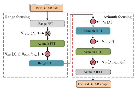 The proposed algorithm in this section mainly includes five steps. First, a LRCMC operation in the azimuth time range frequency domain is to remove most of the linear RCM and mitigate the range-azimuth coupling. Second, a BSRC operation completes the compensation of residual RCM, secondary range compression, and high-order coupling terms in 2-D spectrum. Third, a fourth-order azimuth filtering operation is used to increase the degree of freedom in deriving the azimuth NLCS coefficient expression. Fourth, an azimuth NLCS operation in range Doppler domain is to equalize the azimuth FM rate and remove the azimuth dependence of the quadratic FM rate and cubic phase. Finally, a residual azimuth phase compression operation completes the azimuth focusing. In order to clearly present each step, the flowchart of the proposed algorithm is summarized in Figure 4, where the first two steps belong to range focusing processing, and the last three steps belong to azimuth focusing processing. In what follows, the necessary derivations and explanations of each step are detailed.