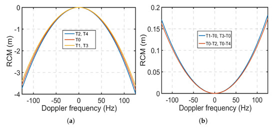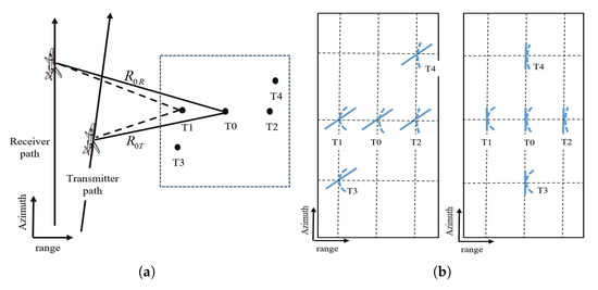 Diagram for the residual RCM evaluation. (a) Diagram of the residual RCMs of targets T0–T4. (b) A diagram of the residual RCMs between targets T1, T2, and target T0, respectively. It can be seen, from (b), that the residual RCM is very weakly range dependent, so we can use the RCM at the reference range to compensate.