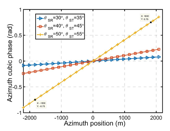 Under the same simulation parameters, as compared with quadratic FM rate, the azimuth-dependent cubic phase is much smaller. Figure 8 shows the relationship between the azimuth-dependent cubic phase and azimuth position in different squint cases. When the azimuth imaging swath is larger than 3.6 km at the squint angles are and , the phase error that is caused by cubic phase will be larger than , the spatial variance of cubic phase term becomes significant. Theoretically, the cubic phase mismatch will cause the sidelobe asymmetry of the focusing result, which will lead to the deterioration of the peak sidelobe ratio (PSLR) and integral sidelobe ratio (ISLR). Therefore, for high-squint biSAR imaging, the azimuth-dependent cubic phase term correction, which is ignored in [16], needs to be considered.