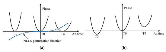 According to the analysis that is presented in the previous sections, the purpose of azimuth processing at this time is clear, that is, to eliminate the azimuth dependence related to in and . It can be solved by using the idea of azimuth NLCS in [16,24], and the schematic diagram is shown in Figure 9. After NLCS operation, the different phase curves of different targets in the same range gate are unified. However, the algorithm faces two problems when dealing with high-squint BiSAR data. One is that the first-order approximation of the azimuth quadratic FM rate is used when deriving the perturbation function, which will cause the mainlobe of the azimuth focusing result to broaden and the resolution to decrease, the other is ignoring the azimuth dependence of the cubic phase term shown in (17), which will lead to insufficient azimuth focus depth and asymmetric sidelobes.