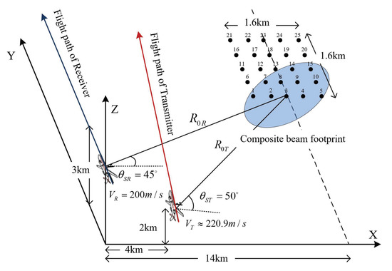 Bistatic synthetic aperture radar (BiSAR) refers to a SAR system where the transmitter and receiver are separately mounted on different platforms, which, hence, increases the appreciable capability, flexibility, and reliability in designing BiSAR configuration [1,2,3,4]. Compared with the monostatic SAR system (MonoSAR), BiSAR system could offer many additional advantages, such as frequent monitoring, reduced vulnerability, single-pass interferometry, capacity of forward- or backward-looking SAR imaging, and saved costs using an existing illuminators of opportunity with several receive-only systems [2,3,4,5,6,7]. Generally, for airborne BiSAR, to obtain a good overlapping beam, the transmitter and receiver antennas both operate in squint mode. However, the squint BiSAR echo brings more complexities for imaging due to its acquisition geometry. To produce well-focused images, the particular problems for the high-squint BiSAR must be taken into consideration when designing the imaging algorithms.