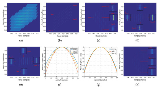 (a) The echo data of the 25 point targets. (b) The RCM trajectories in 2-D time domain after range compression and (c) LRCMC operation. (d) The RCM trajectories in the range Doppler domain before the BSRC operation. (e) And after the BSRC operation. (f) The phase curves of the targets 5, 13, and 21 in 2-D time domain before the proposed modified azimuth NLCS operation. (g) And after the proposed NLCS operation. (h) The RCM trajectories in 2-D time domain after the above processing steps.