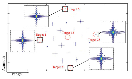 Following the experiment that was done in [16], the simulation uses an array of 25 targets, which are laied out on a 1.6-km grid in ground range/azimuth, as shown in Figure 10. The point target layout corresponds to the range invariance region that limits the resolution broadening to [16,20]. A rectangular window is used in both the range and azimuth processing, instead of an antenna pattern, i.e. no weighting is used, which enables more quantitative evaluation of imaging results. The oversampling ratio is 1.2 in range; thus, the theoretical range resolution is 0.75 m, which is based on the definition of resolution in [39,40]. According to the PRF and velocity of the senor, we can roughly calculate the azimuth oversampling rate is 3.63 and the theoretical azimuth resolution is 1 m.