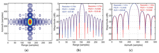 In the imaging, the chirp scaling factor a is set to 0.55. Moreover, the geometric correction is unused, which is helpful for computing the measured parameters of the targets. Observing the results, we can find that all of the targets are well focused. Target 13 is the center of the scene (which is also the reference point target), target 25 is the furthest target from target 13, and, therefore, suffers the largest azimuth and range phase degradation. They are the most representative points to evaluate the imaging performance of the algorithm [16,22]. Figure 13 and Figure 14 show the impulse responses of these two representative target points, respectively, with the measured values of the resolution, the peak sidelobe ratio (PSLR), and the integrated sidelobe ratio (ISLR) annotated. For precise comparison, the figures also give the imaging results (red line) that are focused by the backprojection (BP) algorithm in [8], which is a time-domain algorithm with high accuracy.