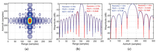 From Figure 13, it can be seen that the reference target 13 is focused perfectly, it has no broadening in both range and azimuth, and its measurement indexes (blue font) are very close to that obtained by the BP algorithm (red font). According to the contour plot in Figure 14a, the focusing result of target 25 as compared to target 13 is not perfect due to the range and azimuth phase degradation. However, for the edge target, there is negligible broadening in range, whereas azimuth broadening is less than . The range PSLR deviates from the theoretical value of −13.3 dB by less than 0.06 dB, the azimuth one is less than 0.12 dB, and the range and azimuth ISLR is within 1dB from the expected value of −10.0 dB. Moreover, under the given simulation parameters, the proposed algorithm can obtain similar focusing capabilities with the BP algorithm, and the depth of focus is slightly inferior to the time domain algorithm, which prove the excellent imaging performance of the proposed frequency domain algorithm.