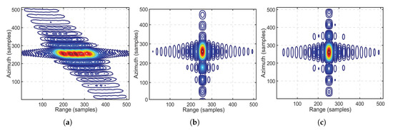 Figure 6 shows the evaluation results of the residual RCM at each point in the scene. From Figure 6a, it can be seen that, after the LRCMC operation, the residual RCMs are greater than three range resolution units, so the residual RCM correction is indispensable. The residual RCM change between the midswath and edge targets (measured at the end of the azimuth aperture) is less than of a resolution cell, which means that the range dependence of the residual RCMs of the targets in the scene is negligible. For second problem, due to the residual RCMs of targets T0, T3, and T4 coincide quite closely in azimuth frequency domain, it can be removed with the same RCM correction shift. For more precise processing, the ideas in [36] are recommended.