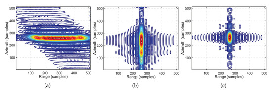 From (27), we can find that the target is focused at position , which is offset from the correct position. This offset can be easily corrected through geometry correction. Related methods can be found [16,24], and they will not be repeated here.