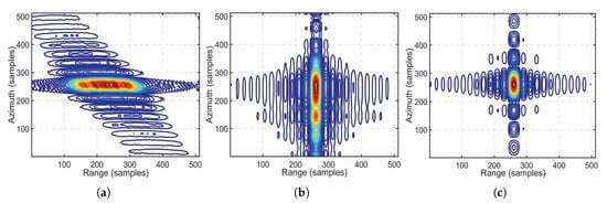 After the LRCMC operation in (9), the RCM mainly includes quadratic and higher order terms, although the higher order terms are usually very small when compared to the quadratic term. Uncorrected range curvature leads to impulse response degradation in both the range and azimuth directions [16,22]. The range focusing of the signal that is processed by LRCMC mainly faces two problems. The first is residual RCM correction.