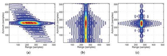 Figure 17 and Figure 18 show the extracted subimages of target 18 and target 23, which have the same range position and different azimuth positions. A worse imaging quality is obtained by the RD algorithm and the NLCS algorithm than the proposed algorithm because of the lack of residual RCM compensation and the increased mismatch of azimuth-dependent azimuth FM rate. To further quantify the performance of the proposed algorithm, the resolution, PSLR, and ISLR are also used as the performace measure. The corresponding imaging performances of the targets 14, 15, 18, and 23 are calculated, and the results are listed in Table 2. Inspecting the Table 2, it is found that the 2-D measured parameters resolution, PSLR, and ISLR obtained by the proposed algorithm agree with the theoretical values. However, the measured parameters that were obtained by the Zhang’s RDA and Wong’s NLCS algorithm are not good, especially in the azimuth direction.