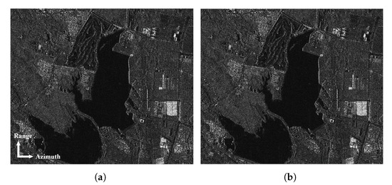 In addition, in order to more intuitively demonstrate the imaging performance of the proposed algorithm, a scene with distributed targets is simulated, in which there are point targets, the backscatter coefficients are replaced by the grayscale values of a existing SAR image, and the interval between the target points is one resolution. Figure 19 shows the imaging results that were processed by the proposed algorithm and the BP algorithm. It can be seen that the scattering characteristics of the SAR images are well displayed, and their focusing results are nearly consistent.