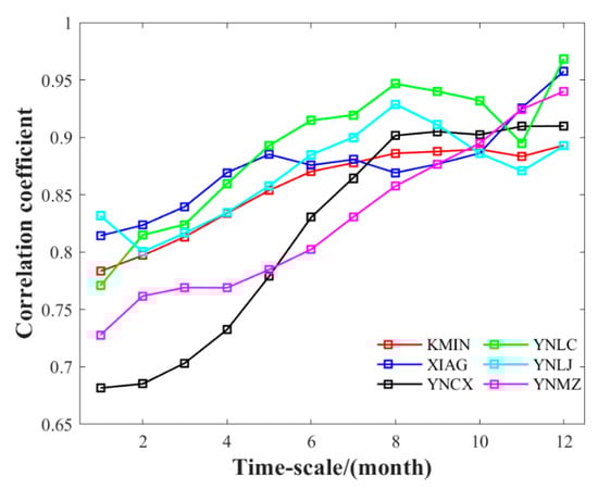 4.1. Different Correlation Coefficients for Different Sites and Scales