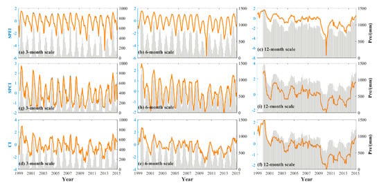 3.2. Correlation Analysis of SPCI/SPEI with CI at Different Time Scales