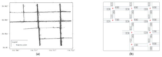 The data used in this case study include about 110 million floating cars’ trajectories, which the geographic coordinate ranges from 116.399450 to 116.431700 and the 39.947934 to 39.966344. The data are the same as those used in the previous study [9,29]. Figure 2a shows the trajectory points, and according to trajectories, we can obtain the topology of the intersection (see Figure 2b). We select ten intersections as the target objects in this study area, whose ID from No.0 to No.9 (see Figure 2b). The selected intersections cover three types, including the regular intersection with four legs (i.e., No.0 to No.7) and the intersection with three legs (i.e., No.8 and No.9).