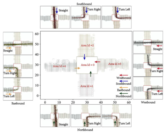 After defining the intersection area range, the turning direction will be identified based on the grid model. First, the legs of the intersection are identified by GFCD and label (see Figure 5). The intersection legs can be divided into five areas, and the points of FCD are then mapped to the five areas. Then, based on the order of entering and exit Area ID, the direction of trajectory is identified, respectively. Taking southbound straight as an example, the entrance is 2 and the exit Area ID is 1, and it also passes through the central area of the intersection (i.e., ). Based on the grid model’s algorithm, it is simple to identify the direction of the floating cars’ trajectories passing through the intersection.