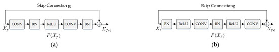 More road network features can be extracted by the deeper model [16]. However, the deeper models are easy to encounter the problem of gradient explosion and vanishing. To solve the problem, the Residual Network (i.e., ResNet) emerges as the times require [34], whose core idea makes the model deeper through the skip layer connection (see Figure 6a). The “Conv” indicates a convolutional layer, “BN” denotes a batch- normalization layer, and “ReLU” represents an activation layer. In this study, we use the improved structure of ResNet, which can solve the vanishing or exploding gradient problem better (see Figure 6b). The ResNet model is shown as follows: