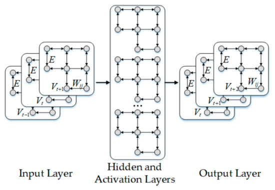 The road network can be regarded as a topological structure composed of points and lines, which points are intersections and lines are roads. When capturing the spatial feature, the CNN models cannot process the non-Euclidean structure’s data and extract the intersection’s topological relationship. In contrast, the Graph Convolutional Network (i.e., GCN) can make up for this defect [22]. It can capture the intersection of topological dependencies. In this study, the intersections are defined on the graph and focus on the structured traffic time series of pass intersection time (see Figure 7). At the time step , the intersections graph can be defined as . The observation is the set of vertices, corresponding to the observations from approaches in the intersections and the is the set of edges, indicating the connectedness between approaches in the intersections, while the is the weighted adjacency matrix of .